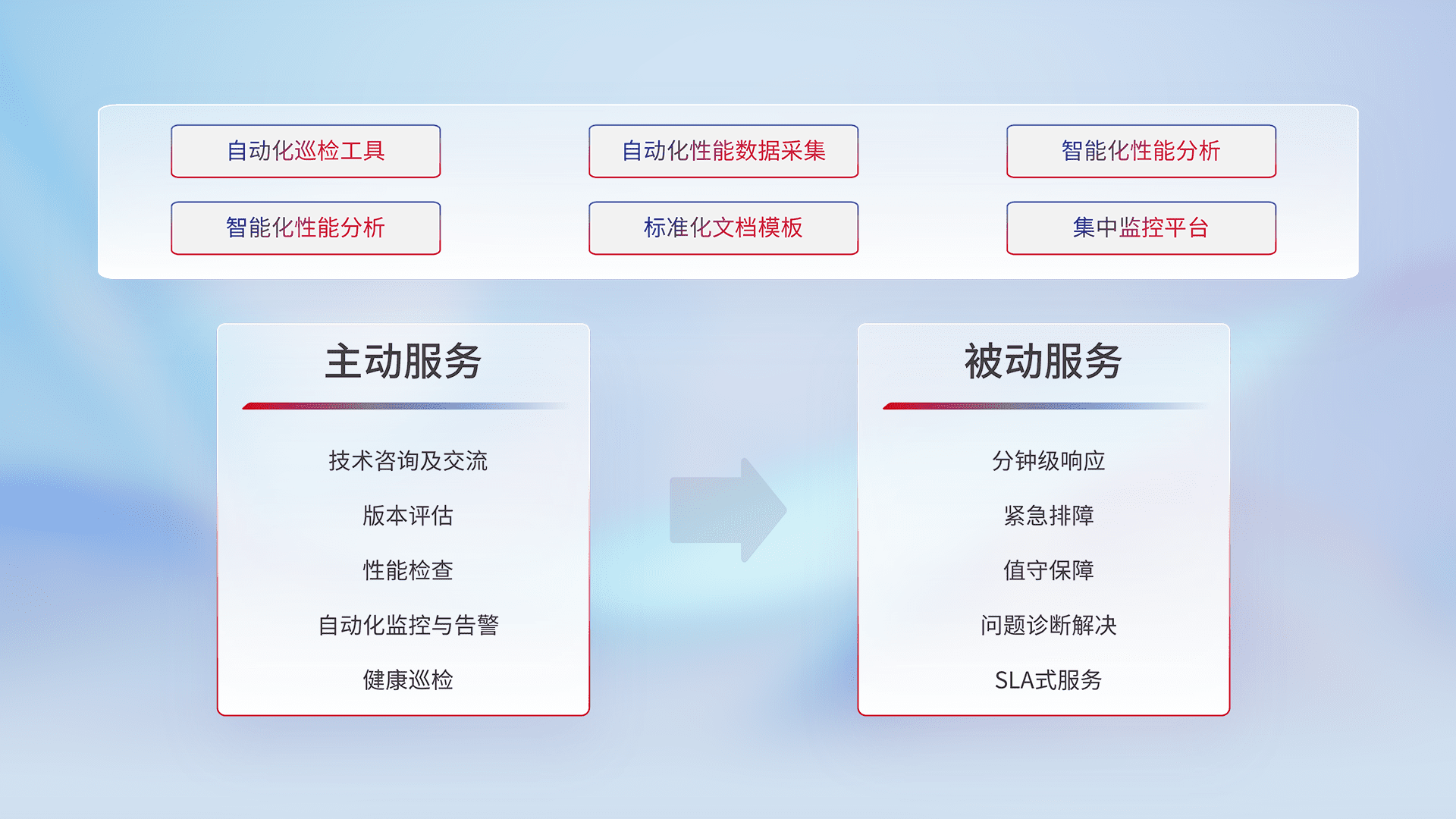 智能化工具和标准化文档,,保障服务质量,,,提供主动服务(包含技术咨询、、、、版本评估、、、性能检查、、、、自动化监控与告警、、、健康巡检)和被动服务包含(分钟级响应、、、紧急排障、、值守保障、、问题诊断解决、、、SLA服务)。。。