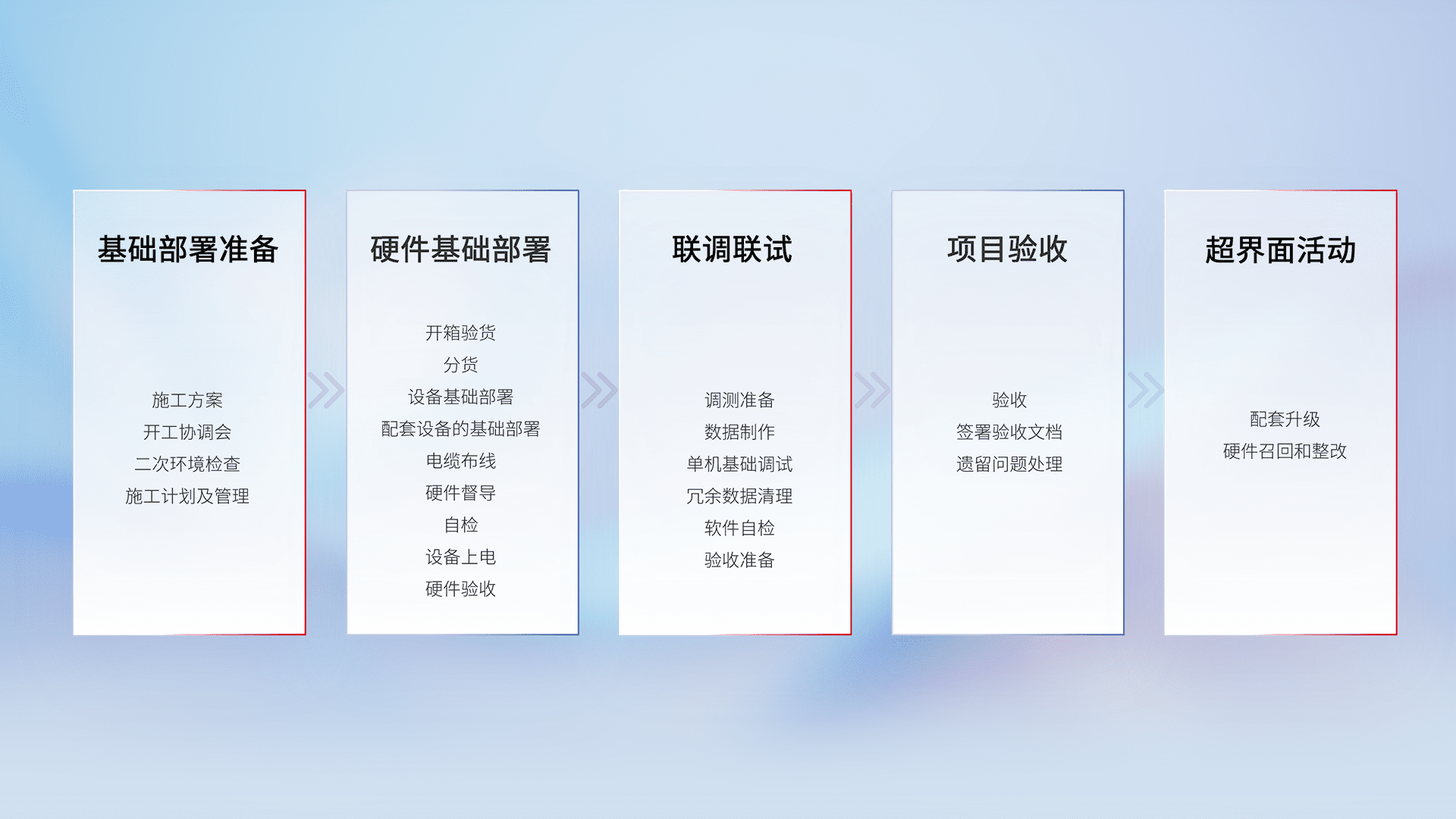 从基础部署准备、、、硬件基础部署、、、、联调联试、、项目验收、、、越界面活动的全过程可追溯,,,,保证施工质量和进度。。。